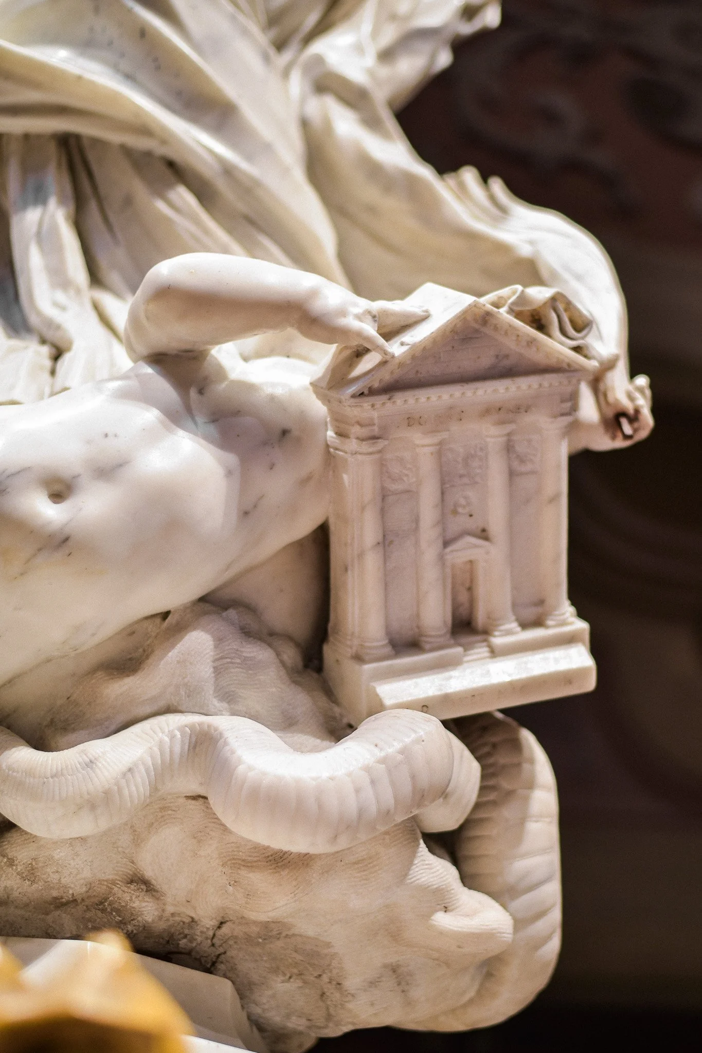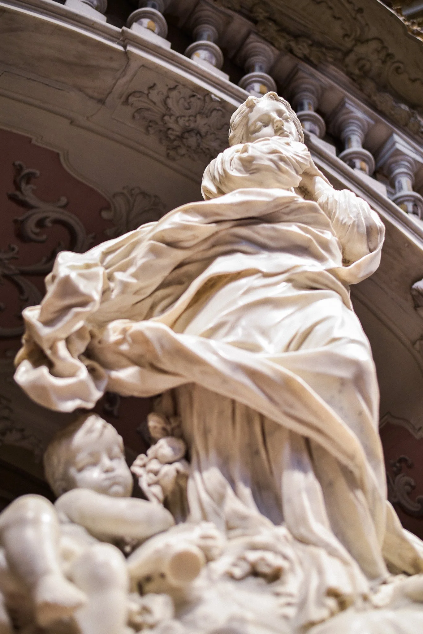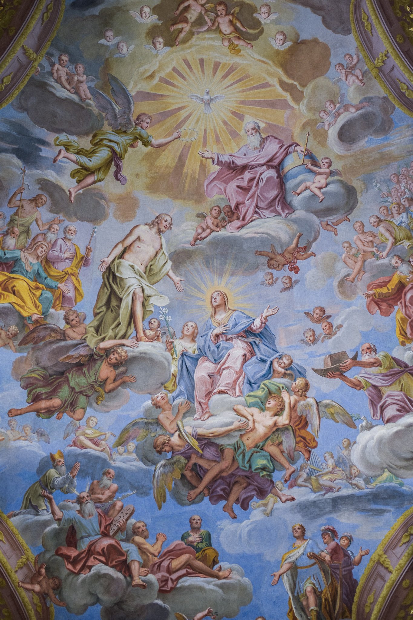 L’artista ha voluto conferire un movimento ad aspirale alla statua per elevare Maria verso l’alto, mentre in preghiera, a braccia conserte, guarda in basso verso lo spettatore.