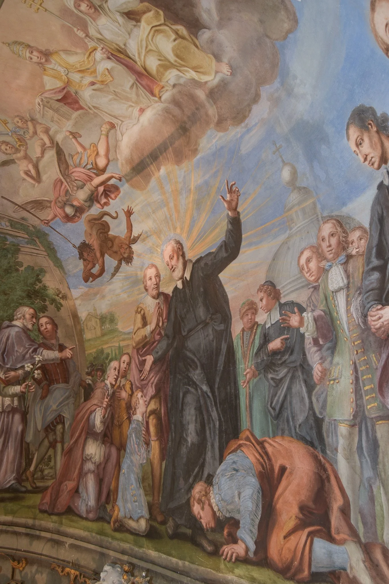 Le quadrature architettoniche sono attribuite a Giuseppe Diavolino (sec. XVIII), mentre gli affreschi sono opera di Jacopo Antonio Boni, che raffigurò le allegorie delle arti, nella volta ‘La Vergine Assunta alla presenza della SS. Trinità tra schiere di angeli’ e nell’abside ‘San Filippo Neri a colloquio con i confratelli’.